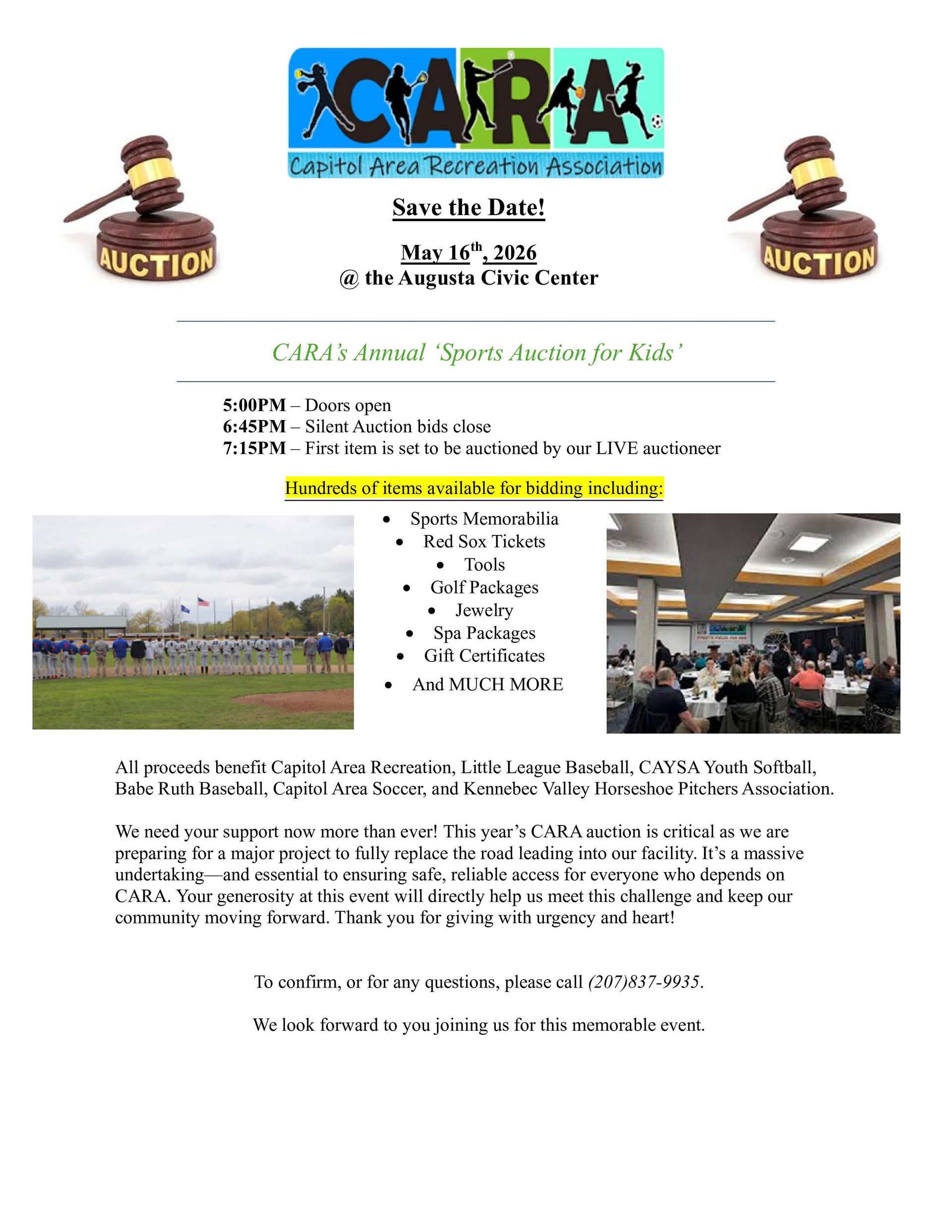 The Capitol Area Recreation Association (CARA) is a volunteer sports complex that covers nearly eighty acres and is maintained and operated by a small group of dedicated volunteers with support from locally committed businesses. A portion of our funding for equipment, capital improvements, maintenance, and youth registration scholarships is raised through the support of local businesses and food concessions. The balance is raised through an annual charity golf tournament and a “Sports Fields for Kids” Live Auction. In June of 2019, we held our first live annual auction and raised over $30,000.00. In 2020, due to COVID-19 and the hardship placed on area businesses, we decided to take a one-year hiatus to help allow our generous businesses to recover from the difficult times.